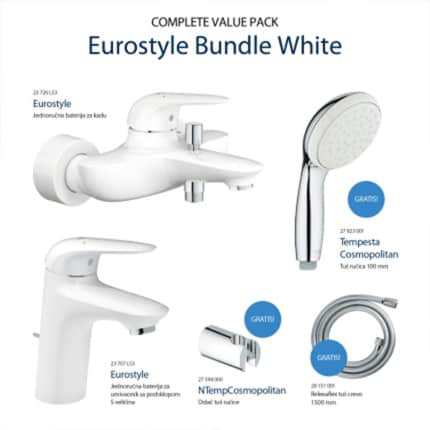 Eurostyle set je set baterija za kupatilo, renomiranog proizvođača Grohe. A Grohe znači kvalitet. Sve njihove proizvode karakteriše vrhunski kvalitet, moderni i elegantni dizajn kao i multipraktičnost. EUROSTYLE TUŠ SET SA BATERIJOM ZA KADU, LAVABO I GRATIS TUŠ RUČICOM, DRŽAČEM I TUŠ CREVOM je set dve baterije za kupatilo. Jednoručna zidna baterija za kadu sa automatskim prebacivačem tuša i stojeća jednoručna baterija za lavabo sa podsklopom.