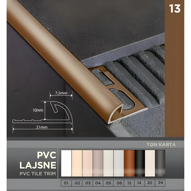 Lajsna 13 braon 10mm je visokokvalitetna lajsna namenjena za postavku keramike. Koristi se za pružanje završnog detalja i zaštitu ivica keramičkih pločica. Sa svojom dimenzijom od 10mm, ova lajsna je pogodna za različite vrste keramičkih pločica i prostorija.