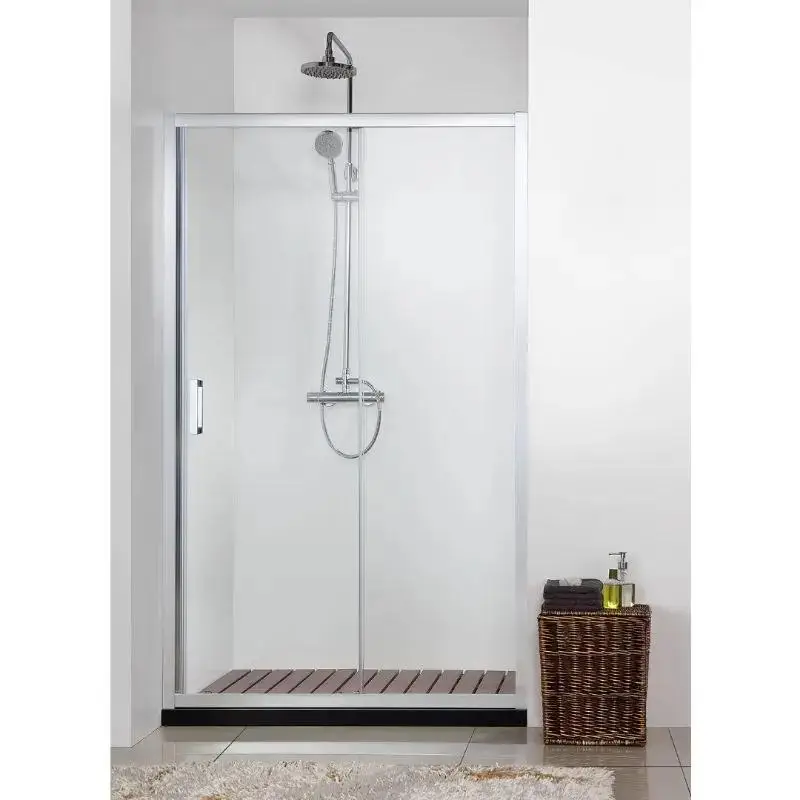 Predstavljamo vam klizna vrata Naa 6121 Enomn brand-a, srebrnog okvira. Izrađena su od kaljenog stakla debljine 6 mm. Sadrže jedno klizno i jednu fiksnu ploču, donje kotačiće sa klikom za čišćenje i dvostruke metalne kotačiće. Moguća je ugradnja na neravnim zidovima koji se podešavaju sa svake strane po 20 mm.