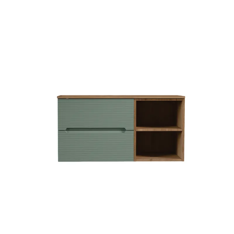 Prednja površina u zelenoj boji sa drvo print dizajnom unosi toplinu i prirodan izgled, dok otvorena polica sa bočne strane omogućava brz pristup najčešće korišćenim stvarima. Ovakva kombinacija zatvorenog prostora i otvorenih segmenata čini ormarić izuzetno praktičnim za svakodnevnu organizaciju. Izrađen od medijapana, ormarić pruža stabilnost i dugotrajnost, a sporo-zatvarajući mehanizam (usporivači fioke) obezbeđuje tiho i uglađeno korišćenje bez naglih pokreta.