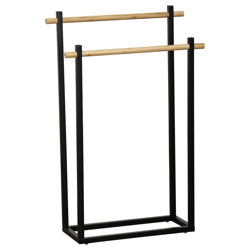 Otkrij Tendance Držač Peškira sa dve prečke dimenzija 53×20×82 cm, izrađen od čvrstog metalnog okvira u mat crnoj boji i luksuznih bambus drvenih šipki. Ovaj kombinovani materijal ne samo da pruža dugotrajnu otpornost, već unosi i toplinu prirodnog bambusa u svaku kupaonicu, čineći prostor jedinstvenim.